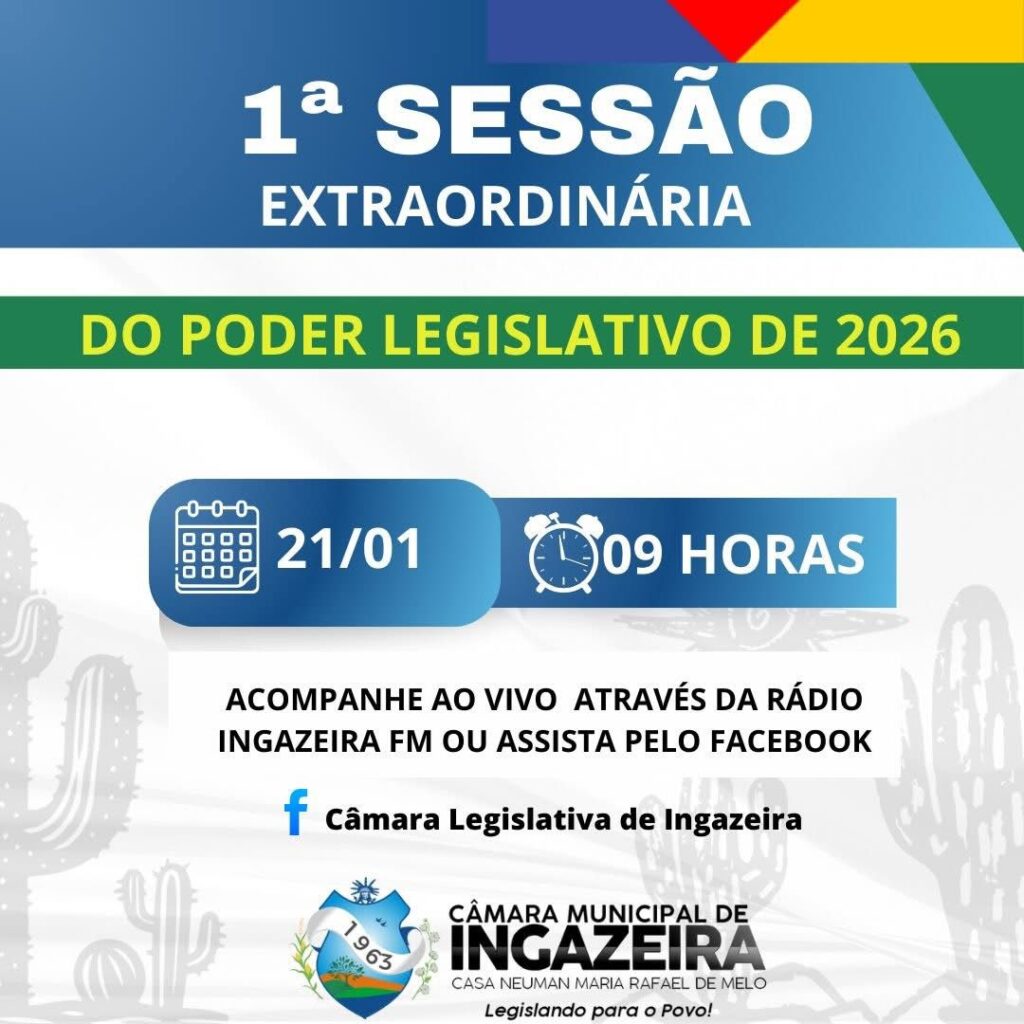 A Câmara Municipal de Ingazeira convida toda a população para participar da 1ª Reunião Extraordinária do 1º Período Legislativo de 2026, que será realizada nesta quarta-feira, dia 21 de janeiro, a partir das 9h da manhã.