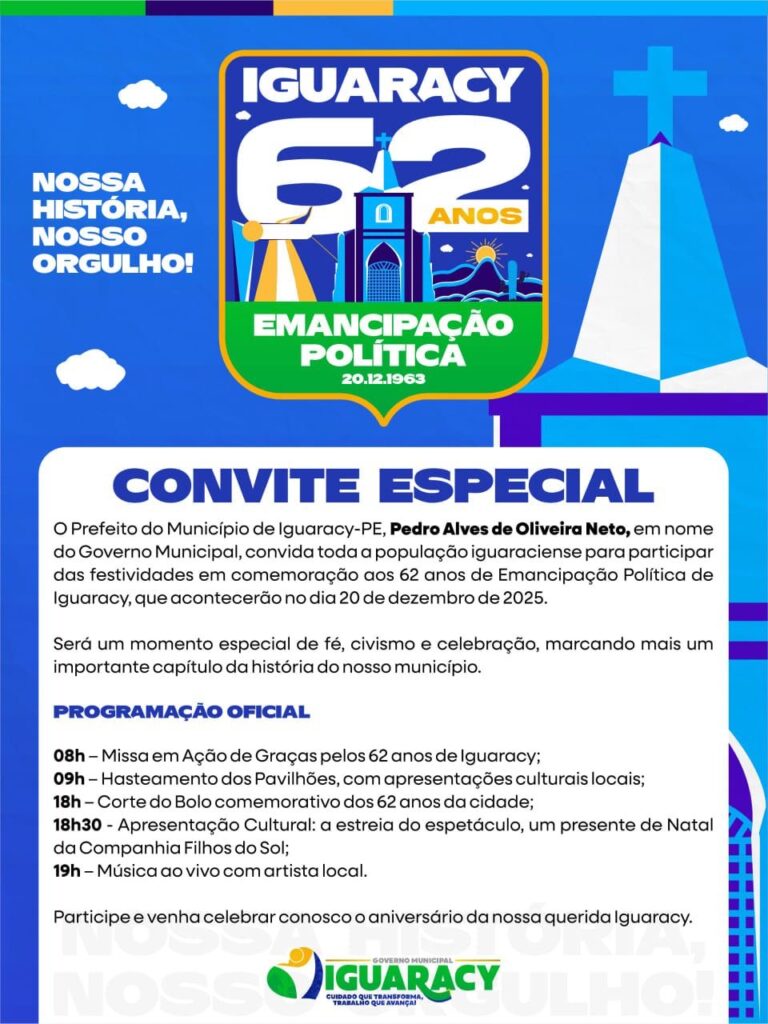 O município de Iguaracy-PE comemora neste sábado, 20 de dezembro de 2025, seus 62 anos de Emancipação Política, e para marcar a data, a Prefeitura preparou uma programação especial que une fé, cultura e celebração.