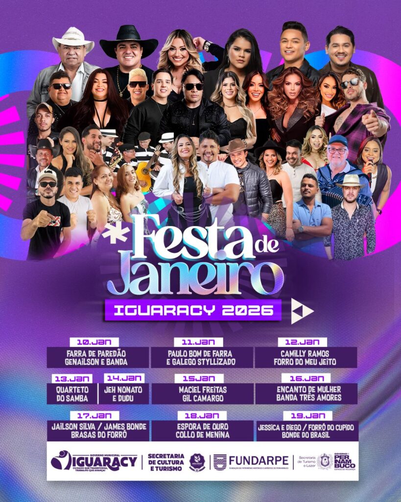 A Prefeitura de Iguaracy, por meio da Secretaria Municipal de Cultura e Turismo, divulgou o cronograma com as atrações que irão animar a Tradicional Festa de Janeiro 2026. A programação vai acontecer entre os dias 10 e 19 de janeiro na Praça Antônio Rabelo, com início previsto por noite às 22 horas, com apresentações musicais e culturais para todos os gostos.