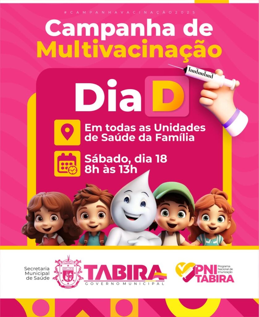 A Prefeitura de Tabira, por meio da Secretaria Municipal de Saúde, realiza neste sábado, 18 de outubro, o Dia D da Campanha Nacional de Multivacinação 2025. A mobilização tem como principal objetivo atualizar a caderneta de vacinação de crianças e adolescentes de 0 a 15 anos, garantindo a proteção contra diversas doenças preveníveis.