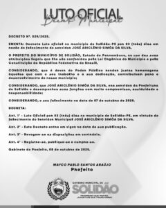 O Governo Municipal de Solidão, por meio do Decreto nº 029/2025, decretou Luto Oficial de três (03) dias em virtude do falecimento do servidor José Ariclênio Simão da Silva, ocorrido no dia 07 de outubro de 2025.