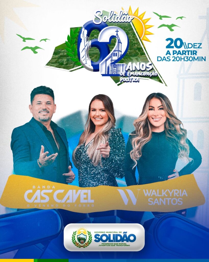 O município de Solidão já confirmou as atrações que irão marcar a celebração dos seus 62 anos de Emancipação Política, comemorados no dia 20 de dezembro, a partir das 20h30.