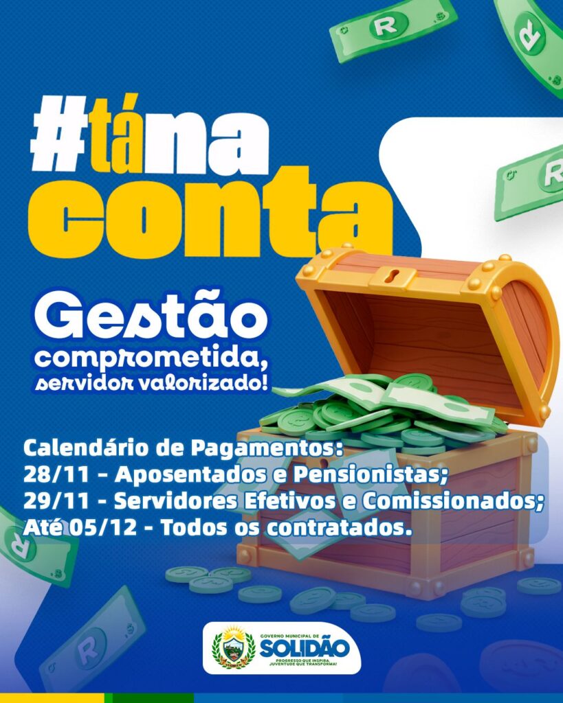 A Prefeitura Municipal de Solidão confirmou, nesta semana, o pagamento integral do mês de novembro para todas as categorias do funcionalismo público, reafirmando o compromisso da gestão com a valorização dos servidores e a responsabilidade na administração dos recursos públicos.